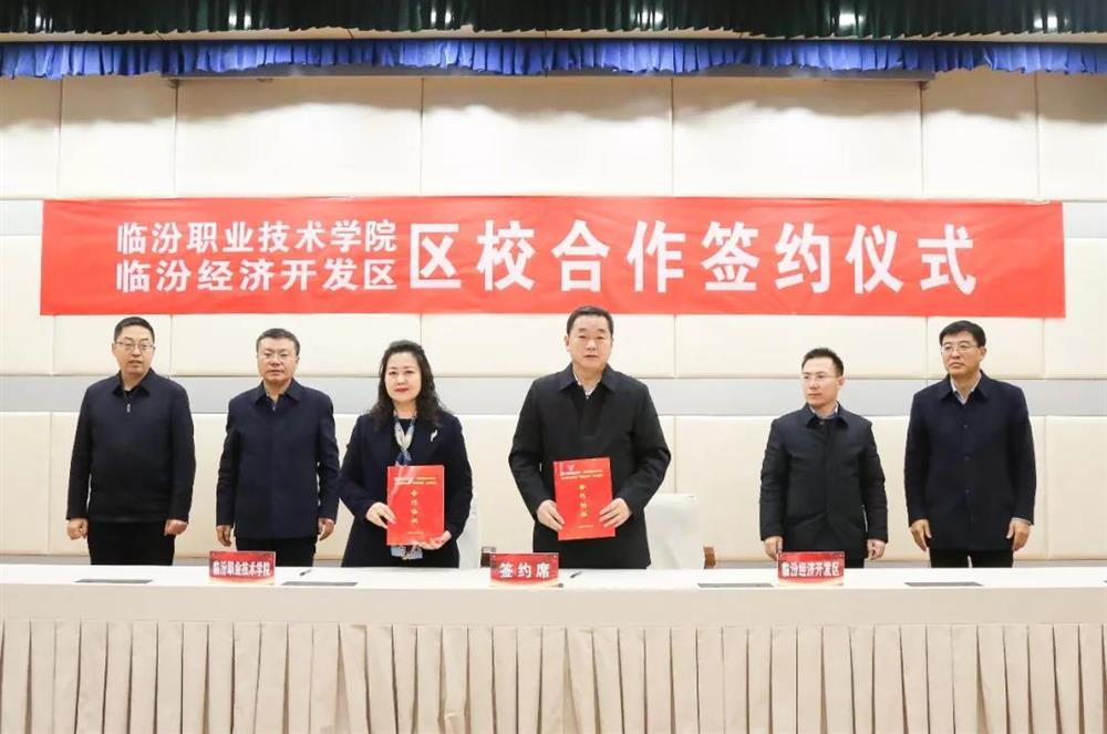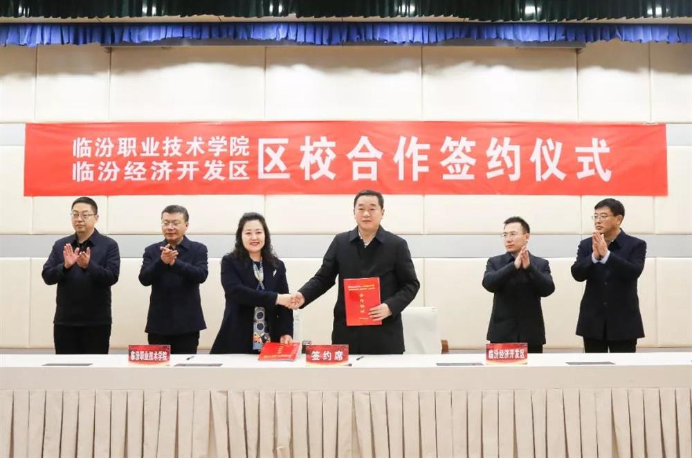 我院院長(zhǎng)段江燕與臨汾經(jīng)濟(jì)開發(fā)區(qū)黨工委書記、管委會(huì)主任元福明簽署區(qū)校合作共建“雙培雙創(chuàng)”工作基地協(xié)議。