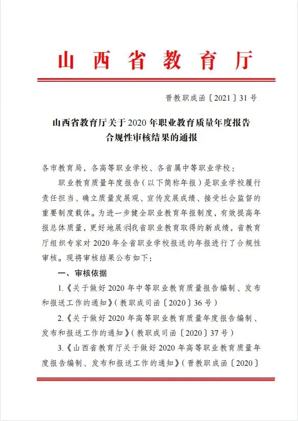 近日,山西省教育廳公布了《關(guān)于2020年山西省職業(yè)教育質(zhì)量年度報(bào)告合規(guī)性審核結(jié)果的通報(bào)》(晉教職成函〔2021〕31號(hào)),從編寫要素完整、圖文數(shù)據(jù)詳實(shí)、寫作邏輯嚴(yán)密、案例典型創(chuàng)新等方面對(duì)全省48所高職院校年報(bào)進(jìn)行了綜合評(píng)審,我院再度獲評(píng)A級(jí),3個(gè)案例入選《山西省2020年高等職業(yè)教育質(zhì)量年度報(bào)告》。這是我院連續(xù)兩年獲得質(zhì)量年度報(bào)告合規(guī)性審核最高等級(jí),連續(xù)兩年成為入選山西省年報(bào)典型案例最多的高職院校之一。