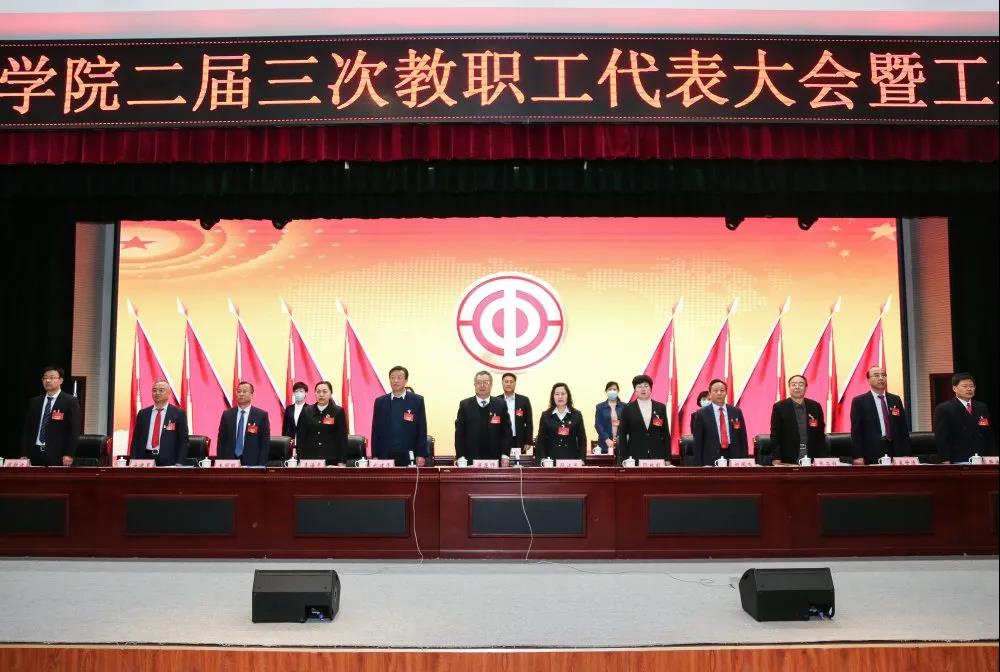 勤勉篤行繪藍圖,砥礪奮進新征程。下午3時,在圖書樓三樓會場,莊嚴的《中華人民共和國國歌》宣告了會議的開始。學院黨委領(lǐng)導傅遵師、段江燕、武建亭、段效毅、李海平、劉鳳鳴、王麗明、張存祥、安建軍、宋世清、侯靜濤,工會主席樊建貴以及大會主席團其他成員出席會議并在主席臺就座。學院黨委副書記武建亭主持大會。“雙代會”全體代表參加會議。