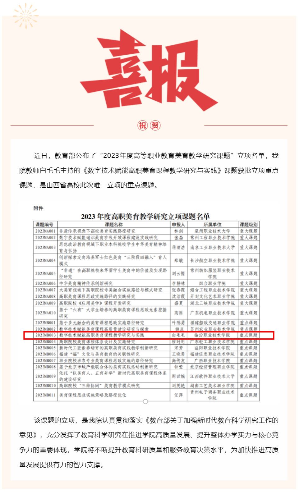 喜報 | 我院獲批1項2023年度教育部職業(yè)院校教指委重點課題