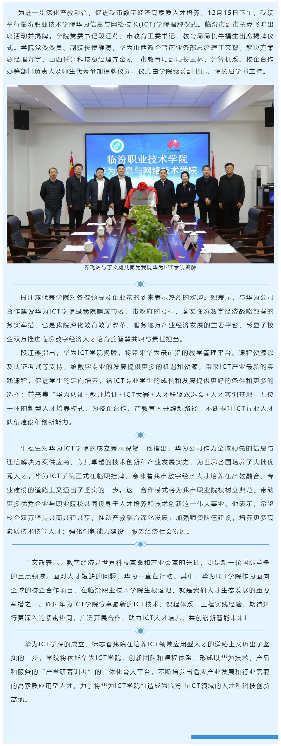 臨汾職業(yè)技術(shù)學(xué)院華為信息與網(wǎng)絡(luò)技術(shù)(ICT)學(xué)院揭牌