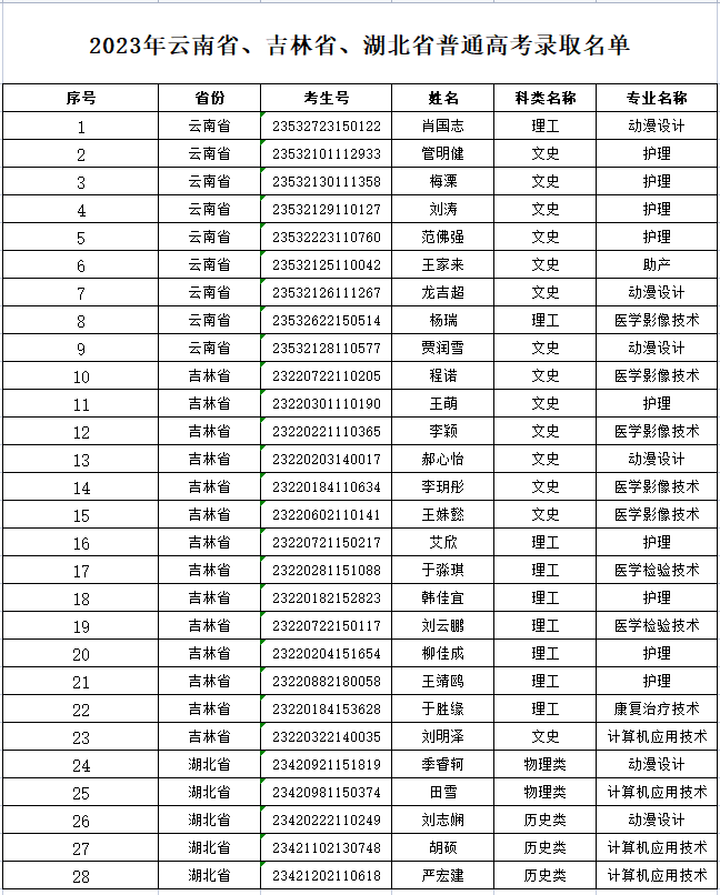 我院2023年云南省、吉林省、湖北省普通高考錄取工作順利結束,考生可憑考生號和身份證號在我院官網(wǎng)“錄取查詢”欄目查詢錄取結果(http://mgswbcom.cn/zsc/lqcx/ptgklqcx.htm)。現(xiàn)將錄取名單公示如下: