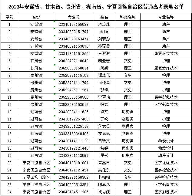 我院2023年安徽省、甘肅省、貴州省、湖南省、寧夏回族自治區(qū)普通高考錄取工作順利結(jié)束,考生可憑考生號(hào)和身份證號(hào)在我院官網(wǎng)“錄取查詢”欄目(http://mgswbcom.cn/zsc/lqcx/ptgklqcx.htm)查詢錄取結(jié)果。現(xiàn)將錄取名單公示如下: