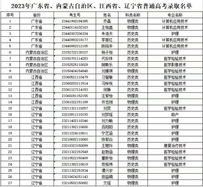 我院2023年廣東省、內(nèi)蒙古自治區(qū)、江西省、遼寧省普通高考錄取工作順利結(jié)束,考生可憑考生號和身份證號在我院官網(wǎng)“錄取查詢”欄目(http://mgswbcom.cn/zsc/lqcx/ptgklqcx.htm)查詢錄取結(jié)果。現(xiàn)將錄取名單公示如下: