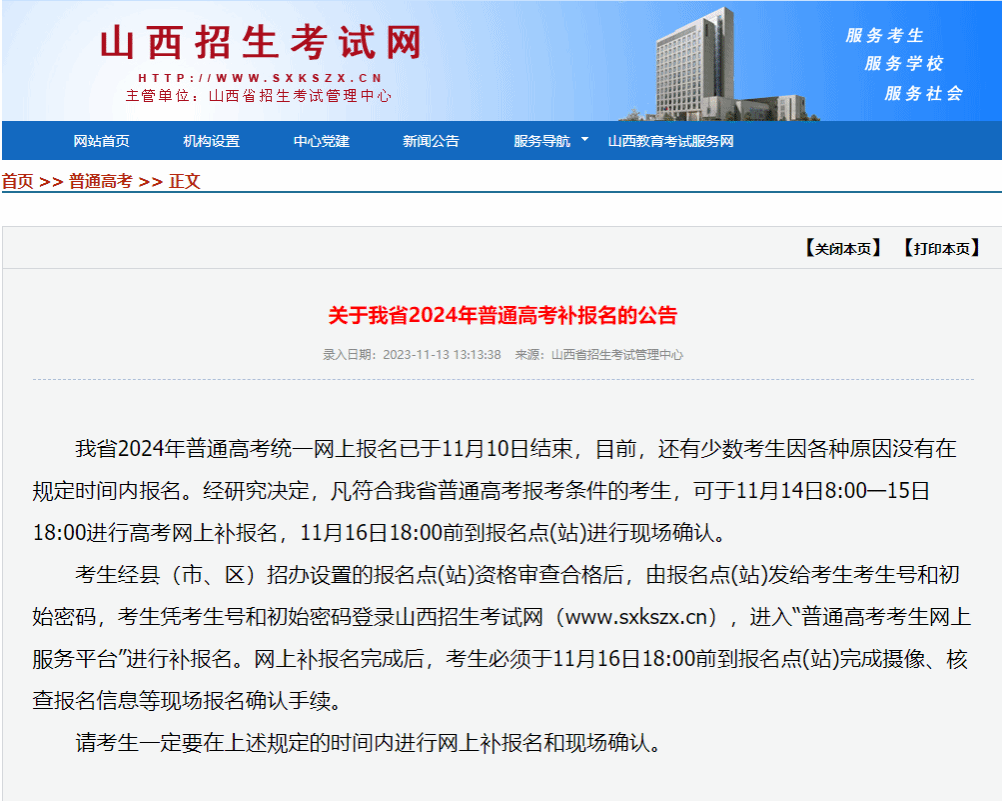 省招考中心11月13日發(fā)布公告表示,我省2024年普通高考統(tǒng)一網(wǎng)上報名已于11月10日結(jié)束,目前還有少數(shù)考生因各種原因沒有在規(guī)定時間內(nèi)報名,經(jīng)研究決定,凡符合我省普通高考報考條件的考生可進(jìn)行高考網(wǎng)上補(bǔ)報名。