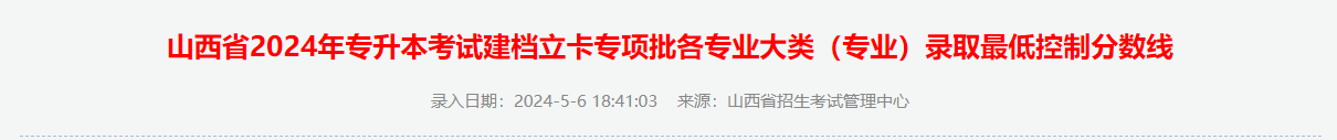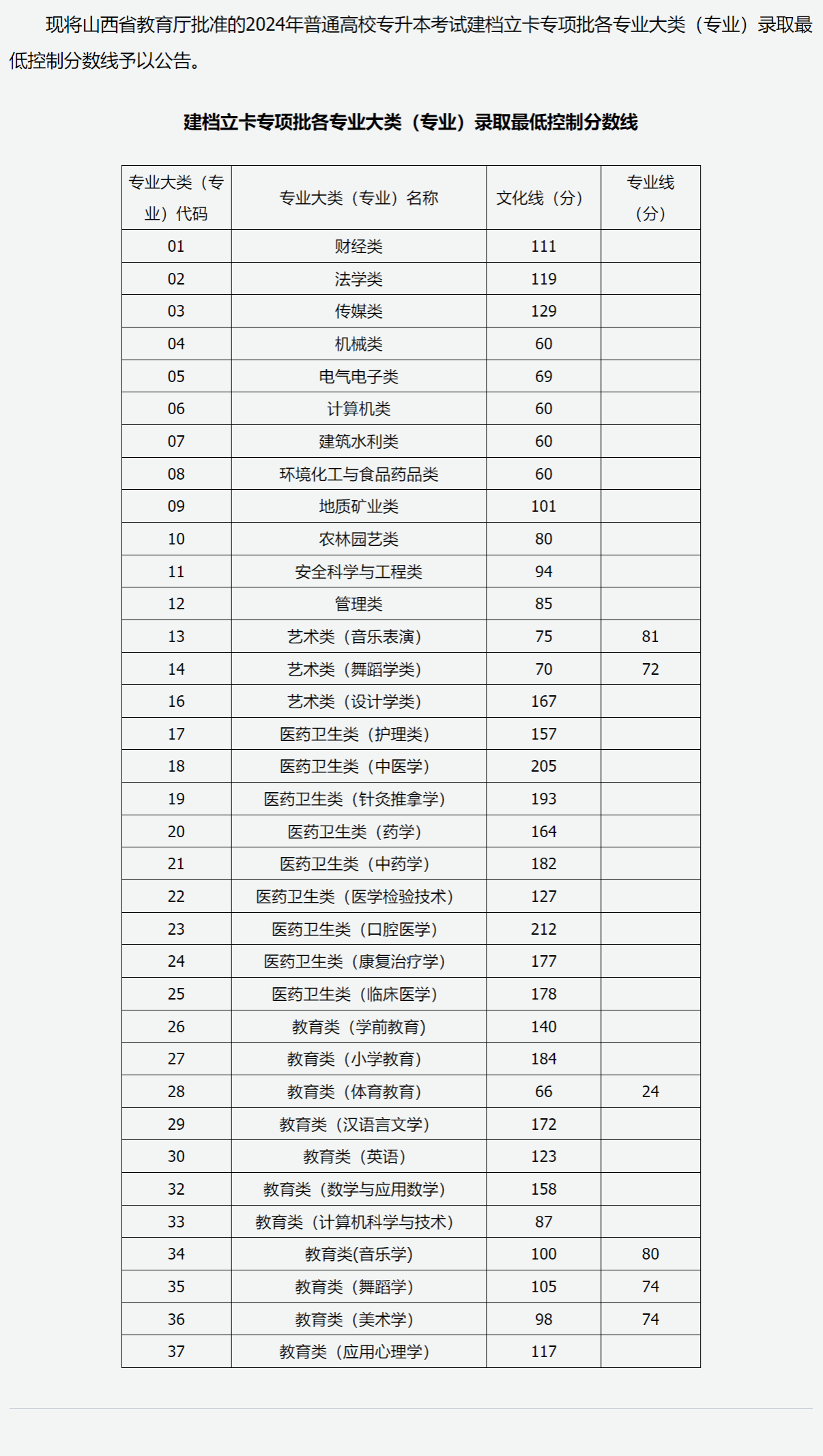 山西省2024年專升本考試建檔立卡專項(xiàng)批各專業(yè)大類(專業(yè))錄取最低控制分?jǐn)?shù)線
