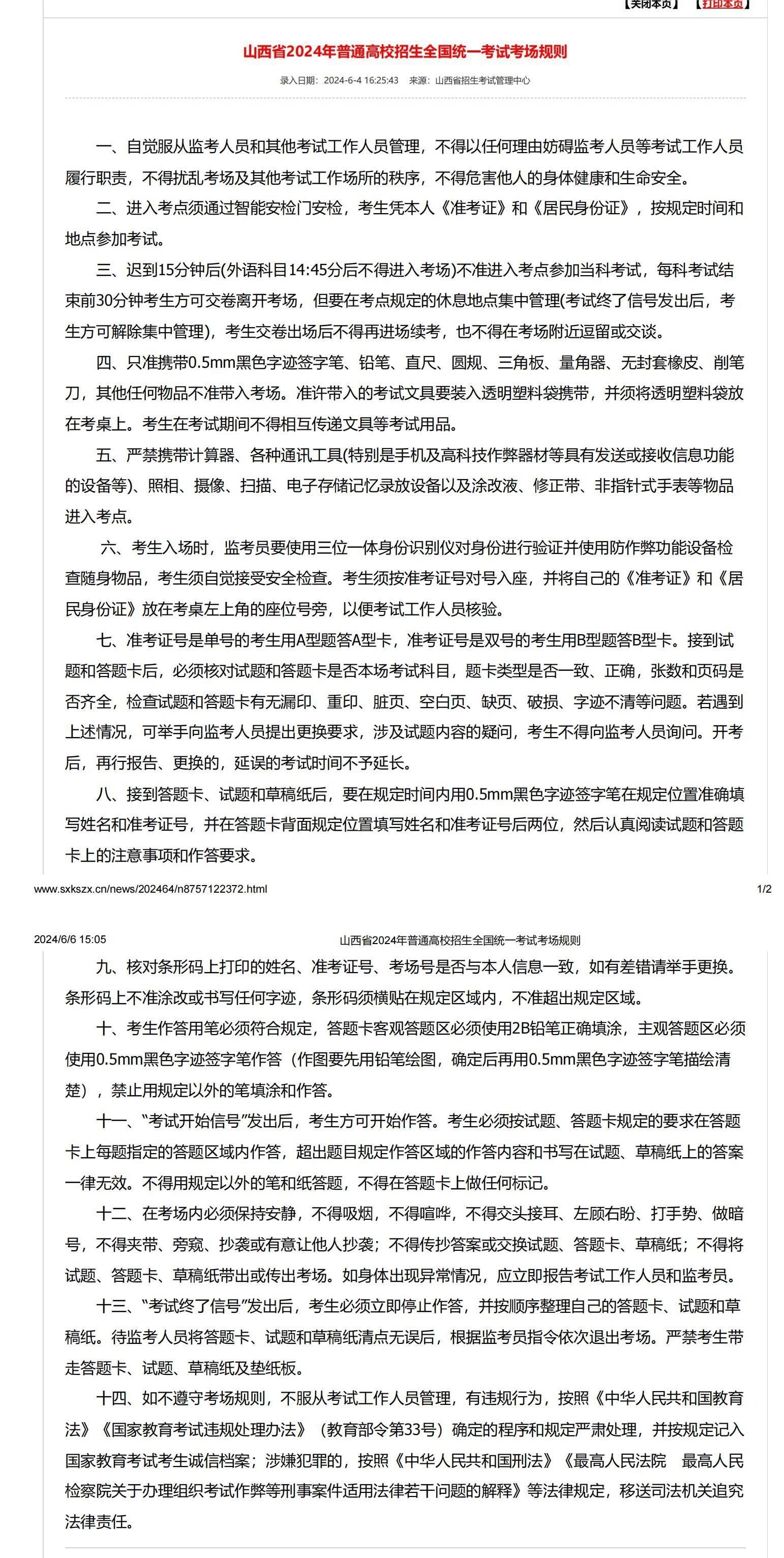 山西省2024年普通高校招生全國統(tǒng)一考試考場規(guī)則
