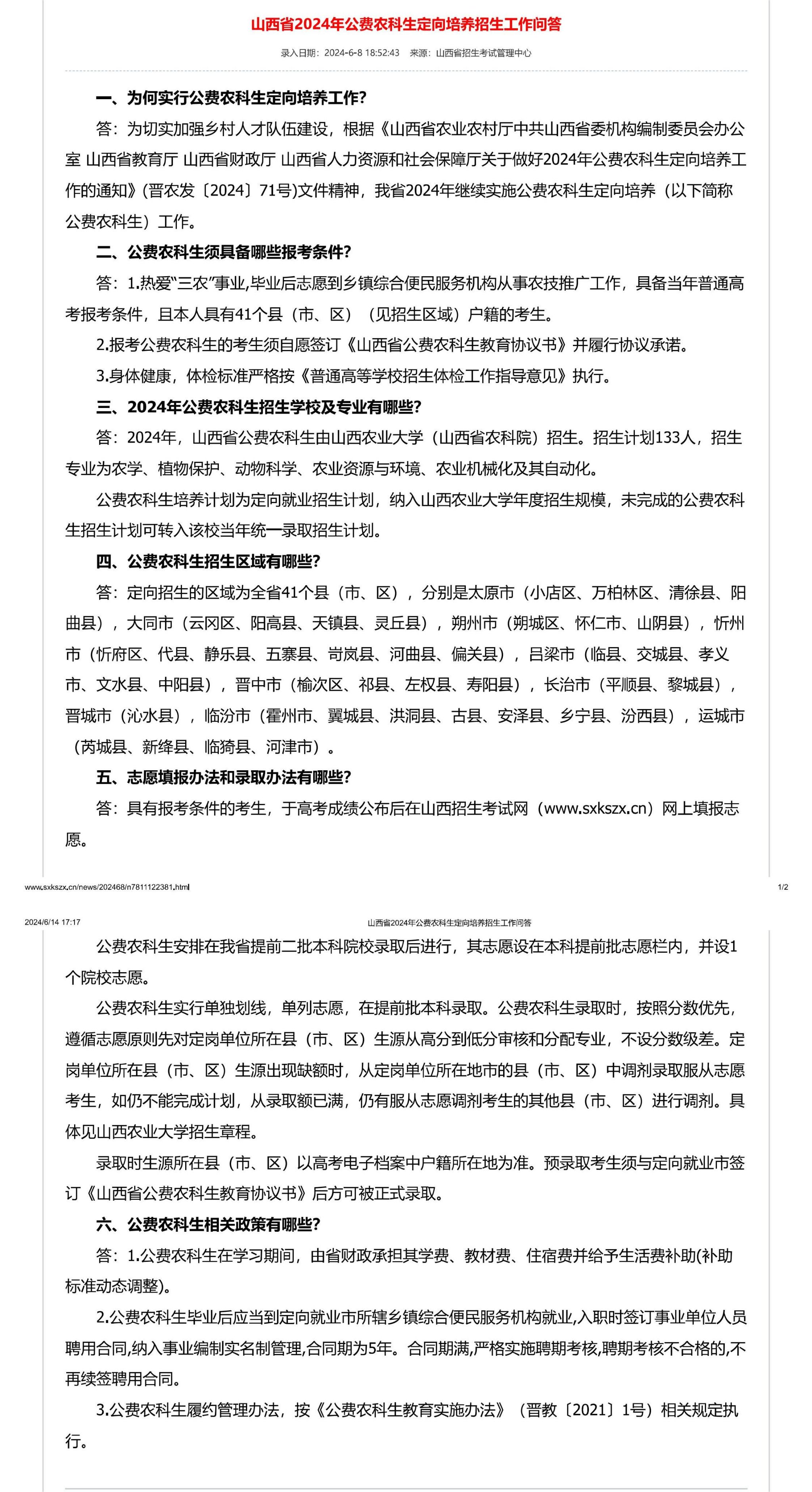 山西省2024年公費(fèi)農(nóng)科生定向培養(yǎng)招生工作問答