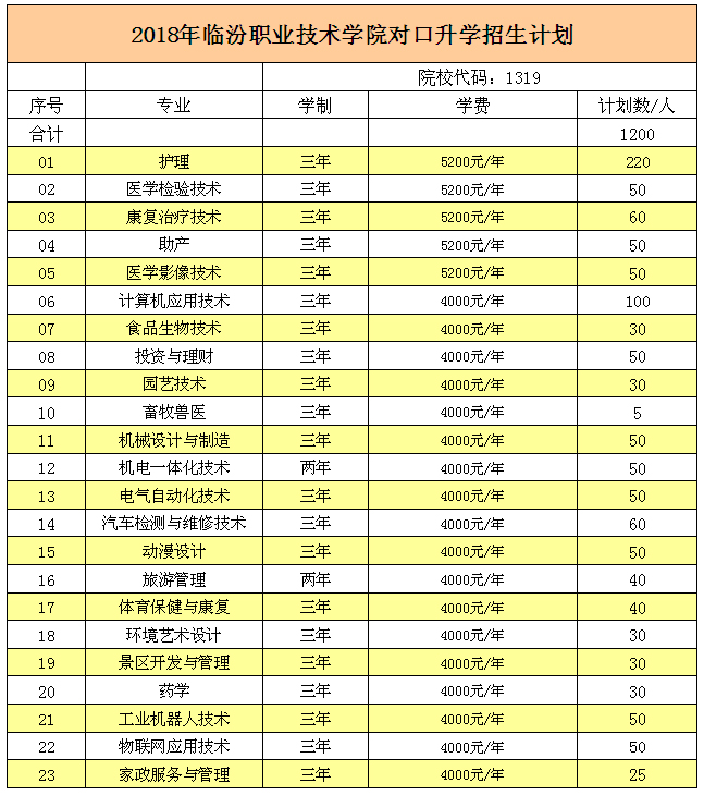 2018年臨汾職業(yè)技術(shù)學(xué)院對口升學(xué)招生計劃