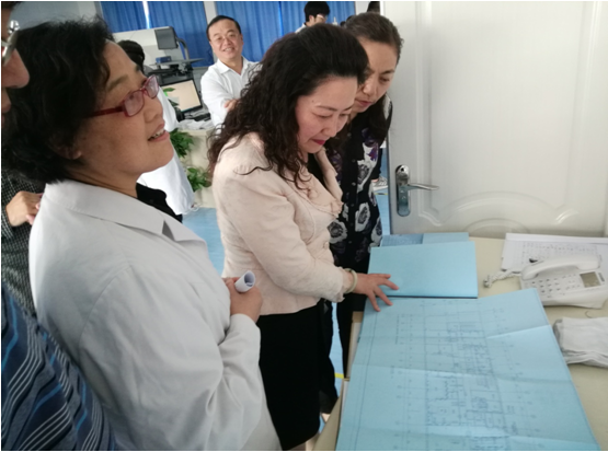 (圖為段江燕院長在查看檢驗科的規(guī)劃圖)