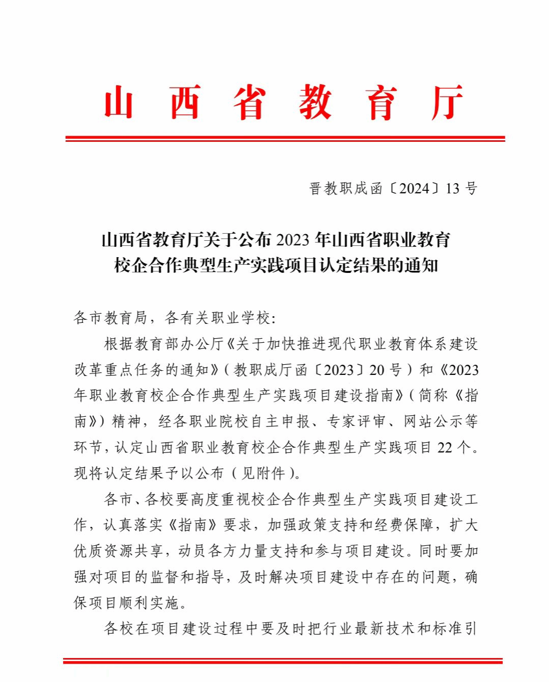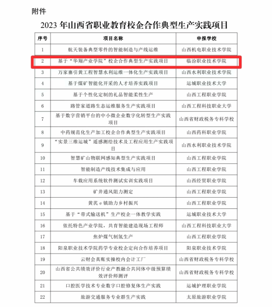 近日,在省教育廳組織的2023年度山西省職業(yè)教育校企合作典型生產(chǎn)實踐項目評選活動中,我院申報的“基于‘華翔產(chǎn)業(yè)學(xué)院’校企合作典型生產(chǎn)實踐項目”成功入選,并推送至教育部。