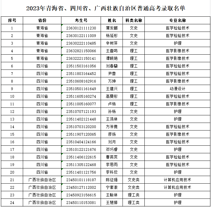 我院2023年青海省、四川省、廣西壯族自治區(qū)普通高考錄取工作順利結(jié)束,考生可憑考生號(hào)和身份證號(hào)在我院官網(wǎng)“錄取查詢”欄目查詢錄取結(jié)果(http://www.mgswbcom.cn/zsc/lqcx/ptgklqcx.htm)。現(xiàn)將錄取名單公示如下: