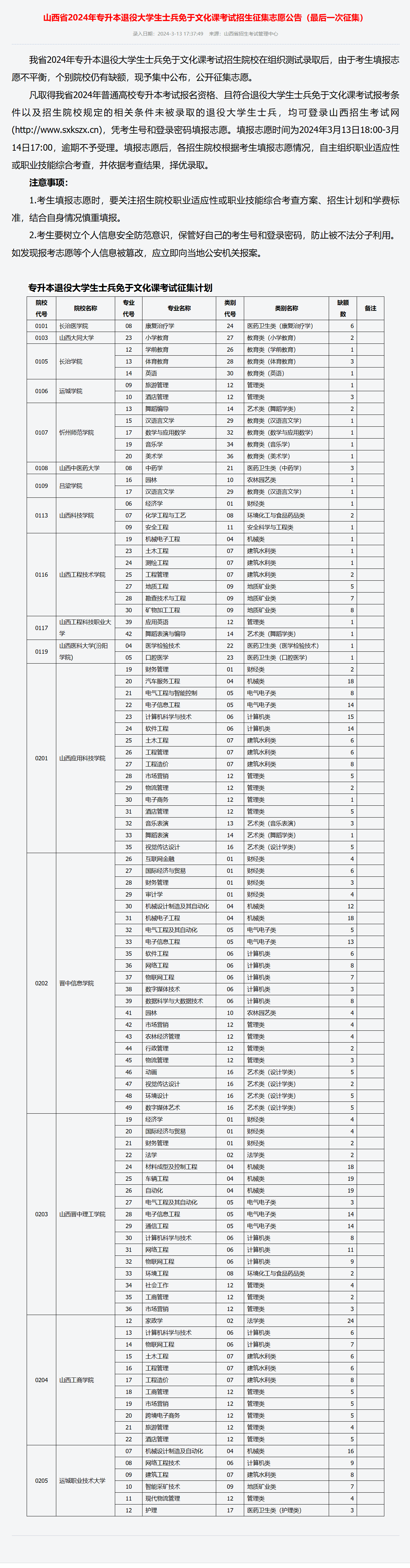 山西省2024年專升本退役大學(xué)生士兵免于文化課考試招生征集志愿公告(最后一次征集)