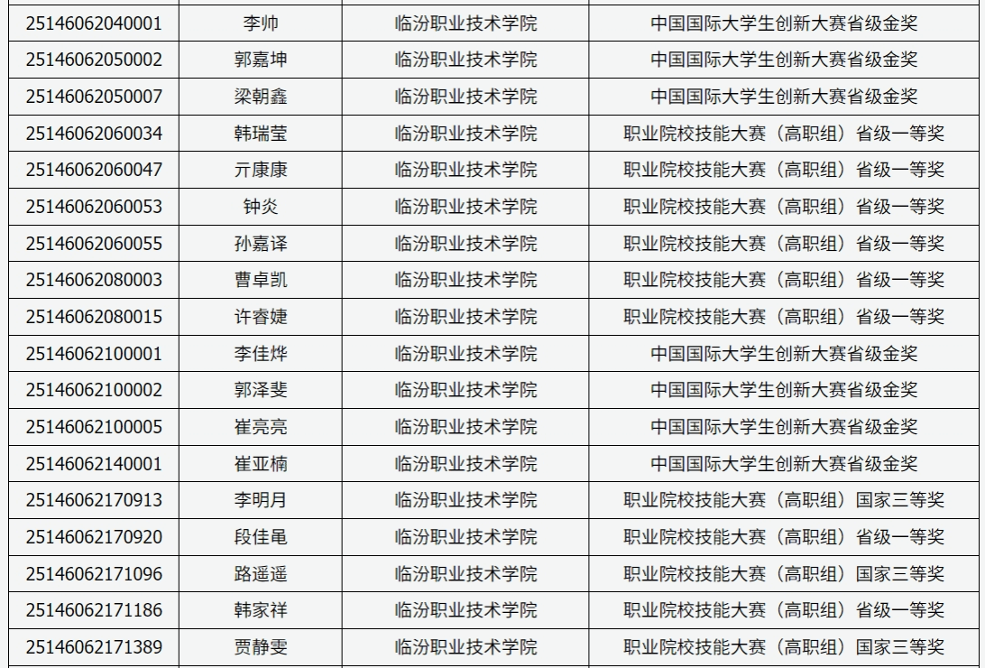 山西省2025年普通高校專升本考試獲獎(jiǎng)加分考生名單公示(僅截取臨汾職業(yè)技術(shù)學(xué)院部分)