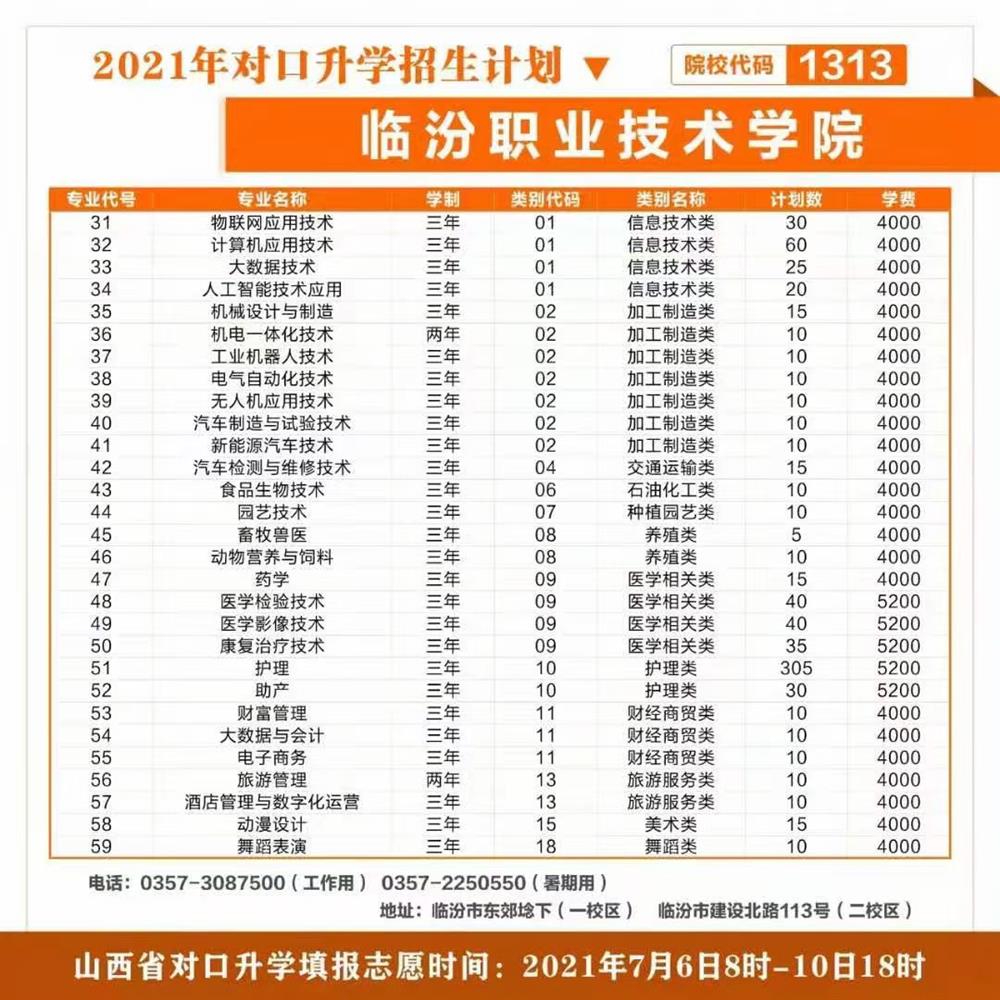 2021年臨汾職業(yè)技術(shù)學(xué)院對口升學(xué)招生計(jì)劃